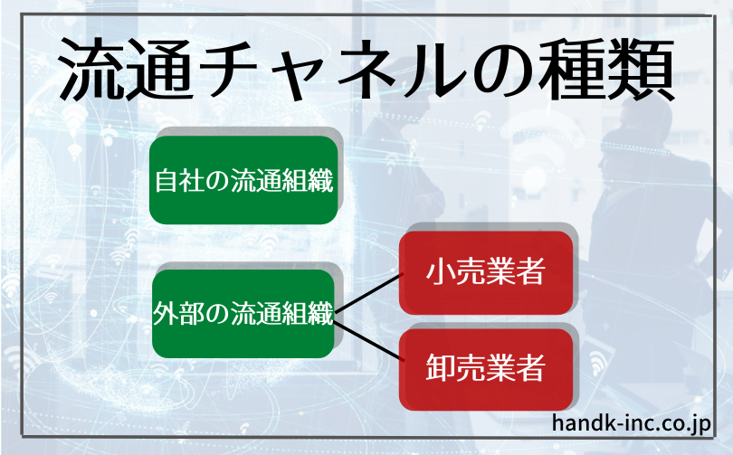 まずは「自社の流通組織」と「外部の流通組織」の違いについて説明します。流通チャネルには、大きく分けて「自社の従業員で構成される営業組織」と「小売店のような外部組織」があります。