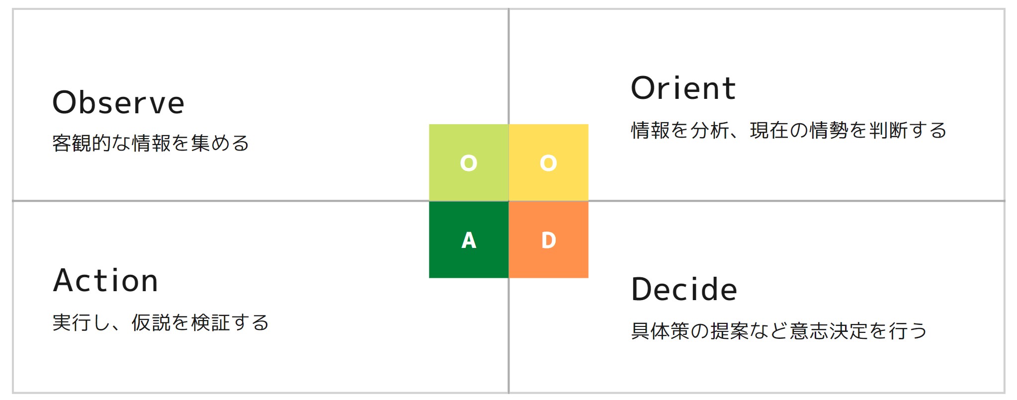では統制のとれたプロセスのために何をすれば良いのでしょうか?実は、PDCA、OODAといったビジネスメソッドを用いれば簡単に統制がとれるようになります。PDCAは”Plan”、”Do”、”Check”、”Act”の頭文字をとったもので、OODAは”Observe”、”Orient”、”Decide”、”Act”の頭文字をとったものです。PDCAは主に「業務内容・品質の改善」のために使われ、は主に「意思決定の速さ改善」に対して使われますが、どちらのメソッドもグロースハックのプロセスを高速化させるには必要です。
