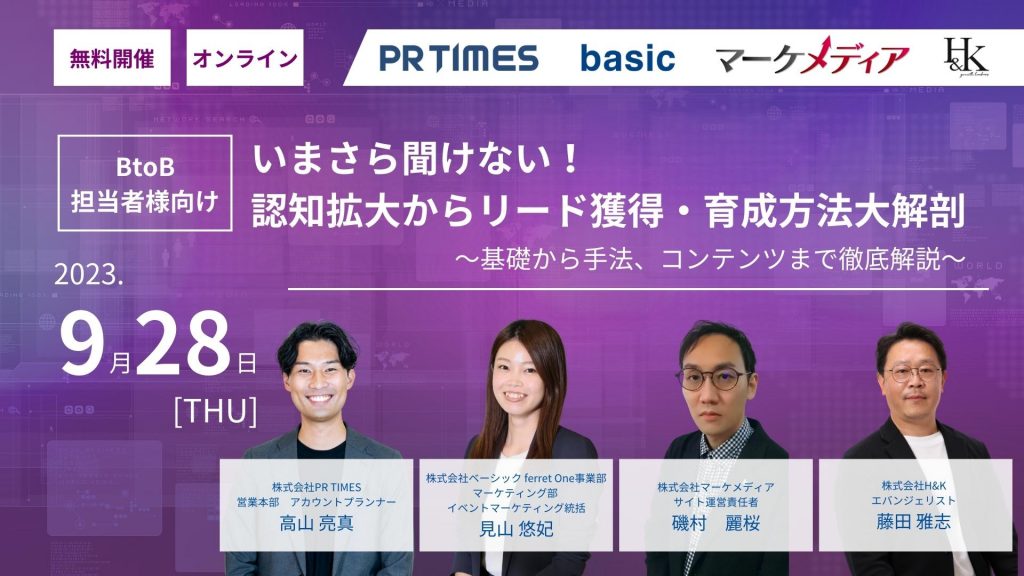 2023年9月28日(木)に、株式会社PR TIMES様、株式会社ベーシック様、株式会社マーケメディア様をお迎えしてのウェビナーイベント「【BtoB担当者様向け】いまさら聞けない!認知拡大からリード獲得・育成方法大解剖 〜基礎から手法、コンテンツまで徹底解説〜」を開催することとなりましたので、ご案内いたします。